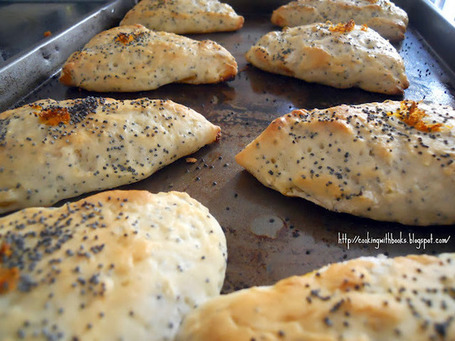 Preheat the oven to 400 degrees and position the racks in the upper and lower thirds. Line two jelly roll pans (deeper cookie sheets) with parchment paper. In a large bowl, whisk together flour, sugar, baking powder and salt. If you do not have a salt grinder, use the base of a heavy skillet to crush the salt on a cutting board (it might help to cover salt with a paper towel so it doesn't turn into mini projectiles in your kitchen). Using a pastry blender or your fingertips, work butter into flour mixture until it resembles coarse meal, with a few pea-sized pieces of butter remaining. Using a fork, stir in 1/2 c buttermilk, balsamic vinegar, juice, yolk and poppy seeds until just combined. The dough should be scraggly and messy-looking.